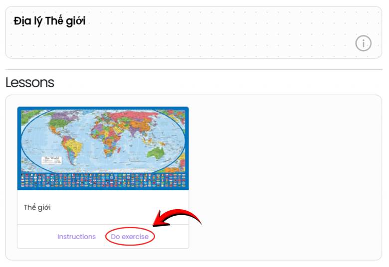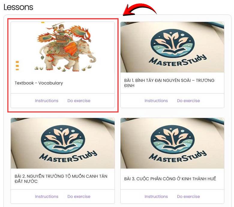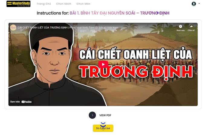 Ở từng bài học, học sinh chọn Instructions để xem video bài học (một số bài học không có sẵn video, những bài này học sinh sẽ xem file lý thuyết ở phần Textbook - Vocabulary) và chọn Do Exercise để luyện tập các câu hỏi lịch sử bằng Tiếng Anh. Hệ thống sẽ chấm và đưa ra câu trả lời đúng để học sinh ghi nhớ.